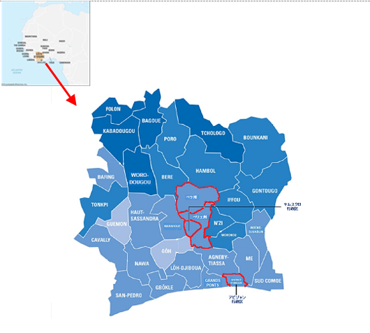 上記図1にも示したとおり、コートジボワールの中央に位置するベリエ州(ヤムスクロ特別自治区を含む)とベケ州が対象地ですが、国内最大の消費地であるアビジャン特別自治区も国産米のプロモーションには重要な場所と位置づけています。